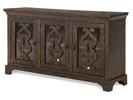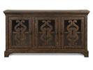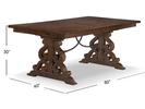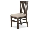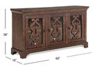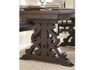 Mediterranean influences create an elegantly approachable and welcoming dining room in St. Claire. A Rustic Pine finish lends a rich, warm hue to the pine solids and veneers with handsome matte black with pewter highlights hardware and accents. The trestle style extension dining table features ornately carved vertical column-like pedestals with a shaped Iron stretcher and expands from 80” to a total of 112” with two 16” center leaves. The server appeals with unique glass doors with wood spatter overlays and is chock full of storage with interior adjustable shelves while the curio cabinet lends further storage and handsome display space behind glass doors with clipped corner wood framing. Seating for the collection includes a straight leg, vertical slat back dining chair and church pew style panel back wooden bench for hospitable options galore.