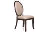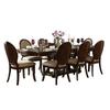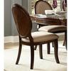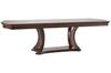 Subtle influence for the design of this is drawn from the classic look of Art Deco styling. The flared pedestal table base ascends to support the book-matched veneer tabletop. Oval wood-backed chairs feature a complementary radiant veneer pattern and neutral toned padded seats and backs. The rich brown cherry finish serves to highlight the exquisite look of the collection's wood veneer.