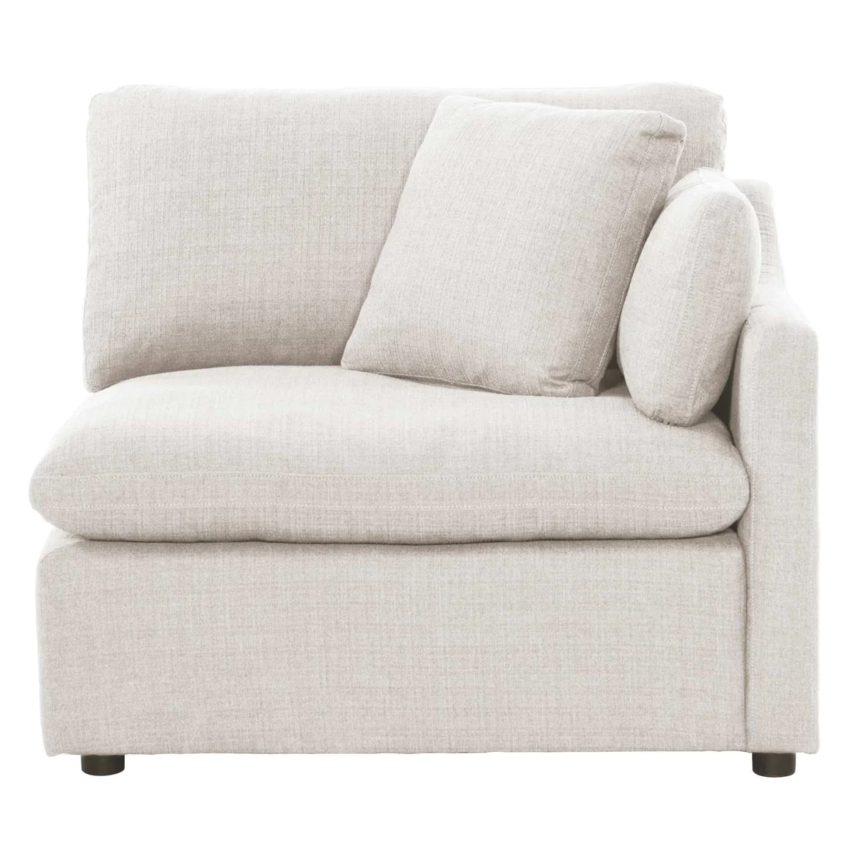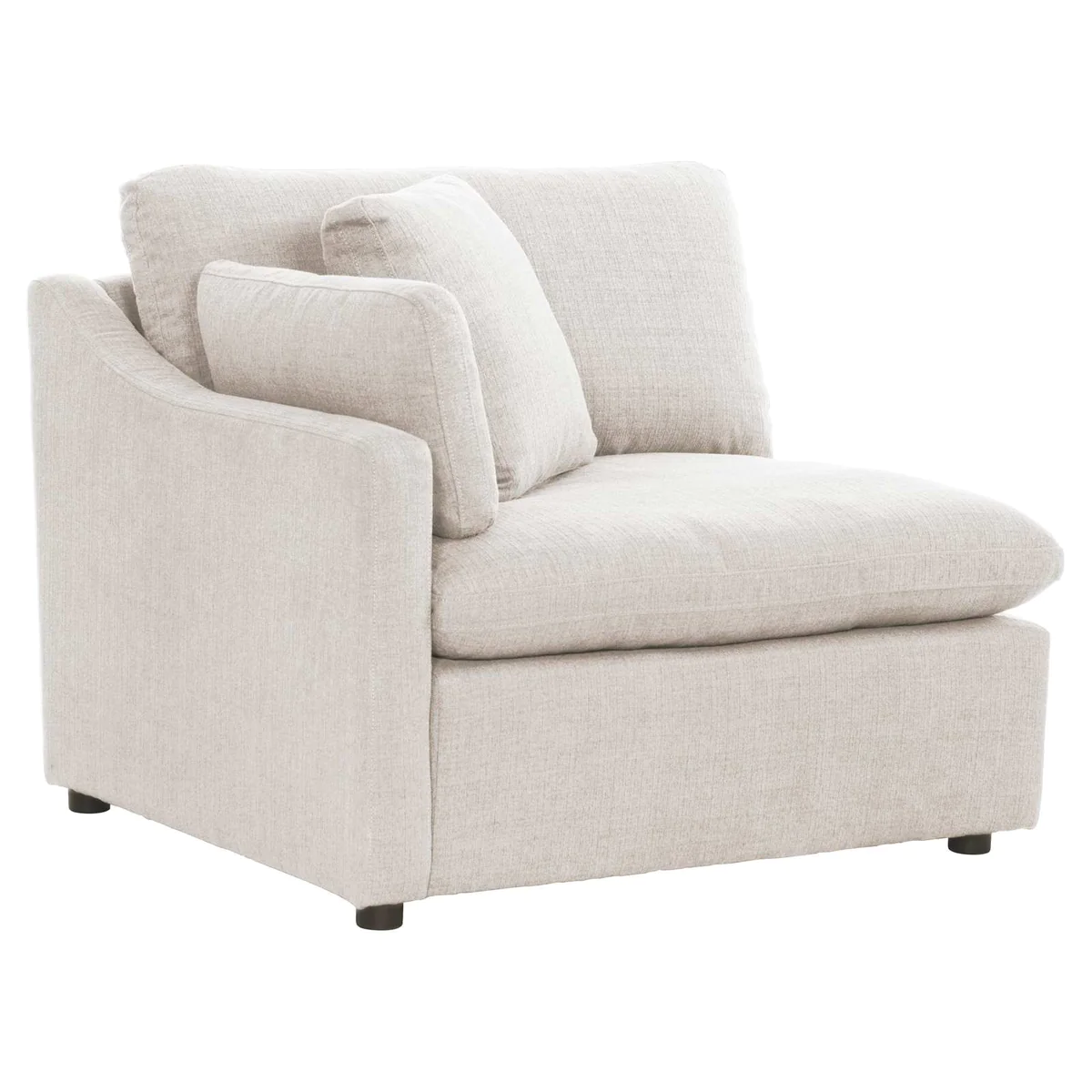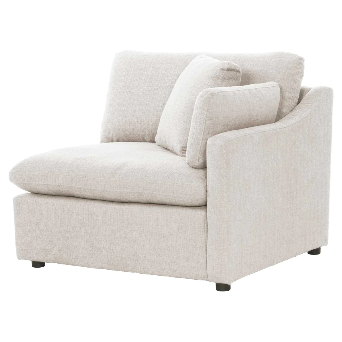 Enveloping your body as you relax into its ample seating, this sectional collection provides an inviting platform for your downtime. Softly textured neutral beige, grey or blue fabric covers this modular sectional seating option with moveable ottoman-chaise, allowing for decorative flexibility within your environment. Loose back cushions and three coordinating toss pillows lend to your ultimate comfort. The sloped arms create subtle contrast to the straight lines of the sectional’s profile. Other modular configurations also available. Also available in grey or blue fabric.