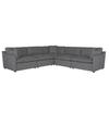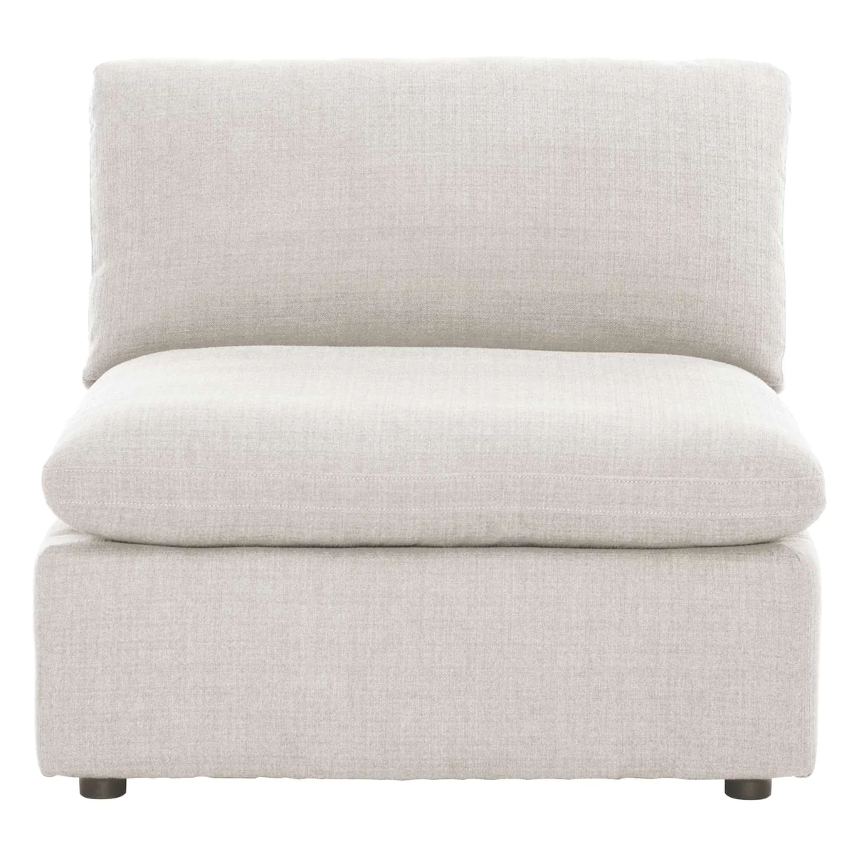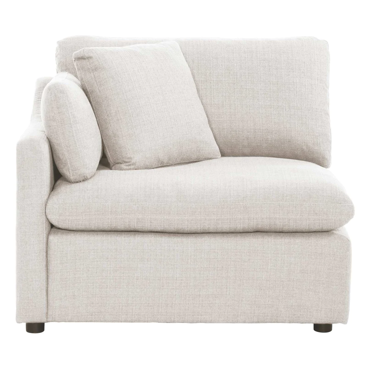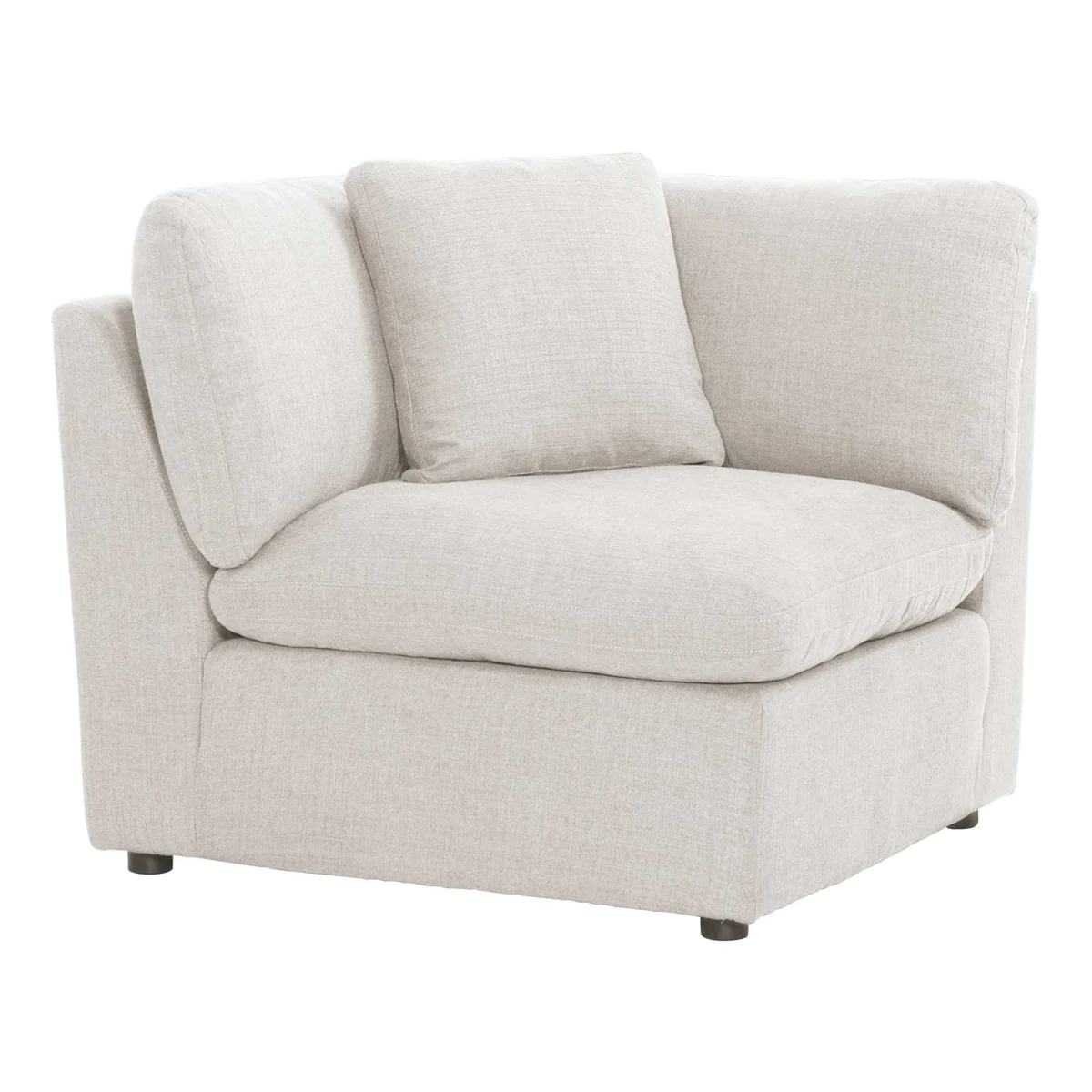Enveloping your body as you relax into its ample seating, this sectional collection provides an inviting platform for your downtime. Softly textured neutral beige, grey or blue fabric covers this modular sectional seating option with moveable ottoman-chaise, allowing for decorative flexibility within your environment. Loose back cushions and three coordinating toss pillows lend to your ultimate comfort. The sloped arms create subtle contrast to the straight lines of the sectional’s profile. Other modular configurations also available. Also available in grey or blue fabric.