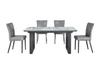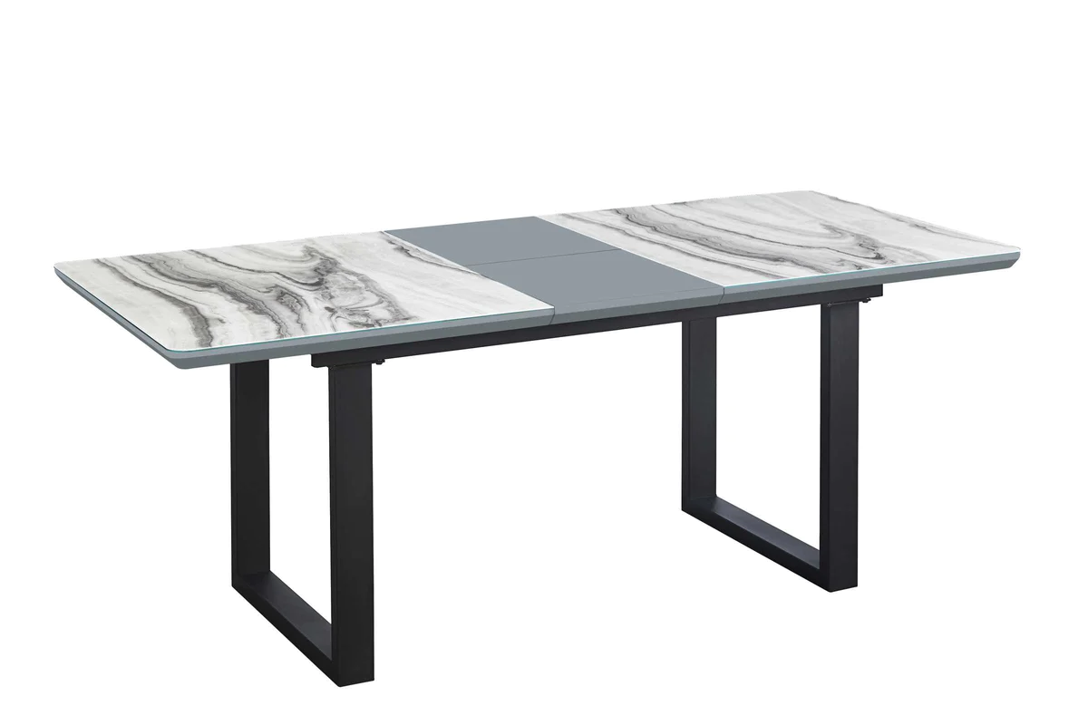 This collection is perfect accent for your contemporary dining room. A beautiful grey and black faux marble finish swirls underneath tempered glass for a tabletop that is both eye-catching and easy to clean, while open-framed black powder-coated metal legs offer sturdy support and an attractive two-tone look. A self-storing butterfly extension leaf in contrasting grey accents your table while also extending it to comfortably sit six to eight people. Coordinating padded chairs are upholstered in grey faux leather with channel tuft detailing along the back and matching black angled metal legs, giving a polished look to the mixed-media finishes of this versatile dining set.
